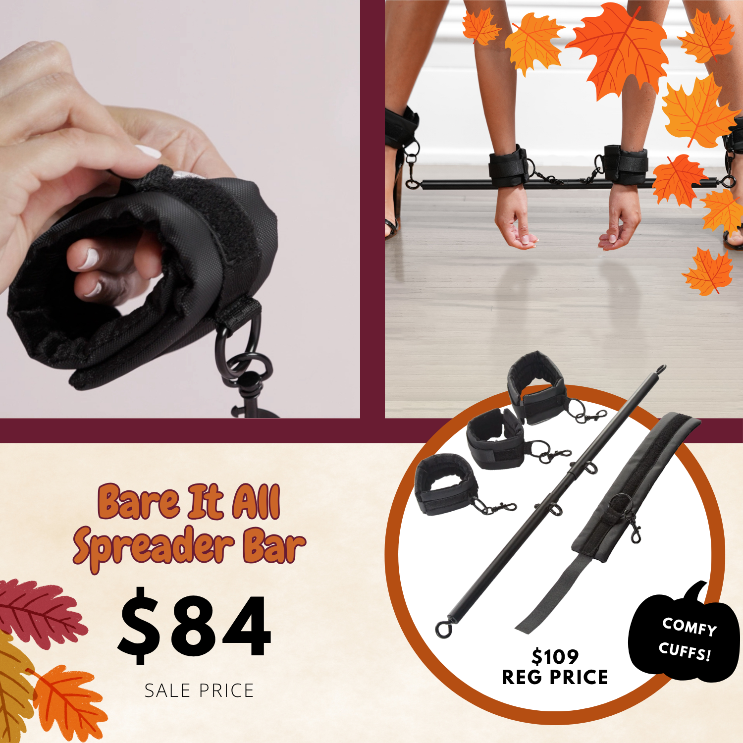 Submit to lust and bare it all with this bar set. The four included cuffs and expandable bar allow for simple control or a variety of compromising positions. Feel the soft cuffs against your skin as your partner tightens them around your wrist, ankles, or both. Give in to their control as the bar extends, holding you in place. Passion, power, and pleasure collide in an unparalleled experience.