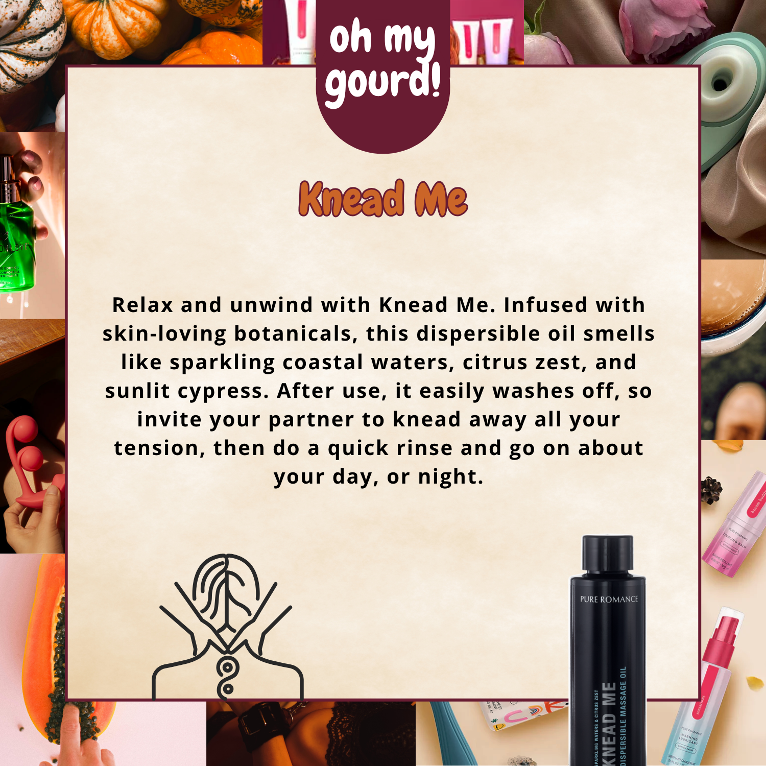Relax and unwind with Knead Me. Infused with skin-loving botanicals, this dispersible oil easily washes off with just water. Invite your partner to knead away all your tension, then do a quick rinse and go on about your day. Your towels will thank you.