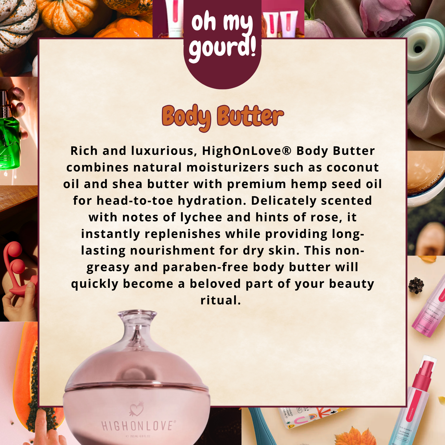 Rich and luxurious, HighOnLove® Body Butter combines natural moisturizers such as coconut oil and shea butter with premium hemp seed oil for head-to-toe hydration. Delicately scented with notes of lychee and hints of rose, it instantly replenishes while providing long-lasting nourishment for dry skin. This non-greasy and paraben-free body butter will quickly become a beloved part of your beauty ritual.