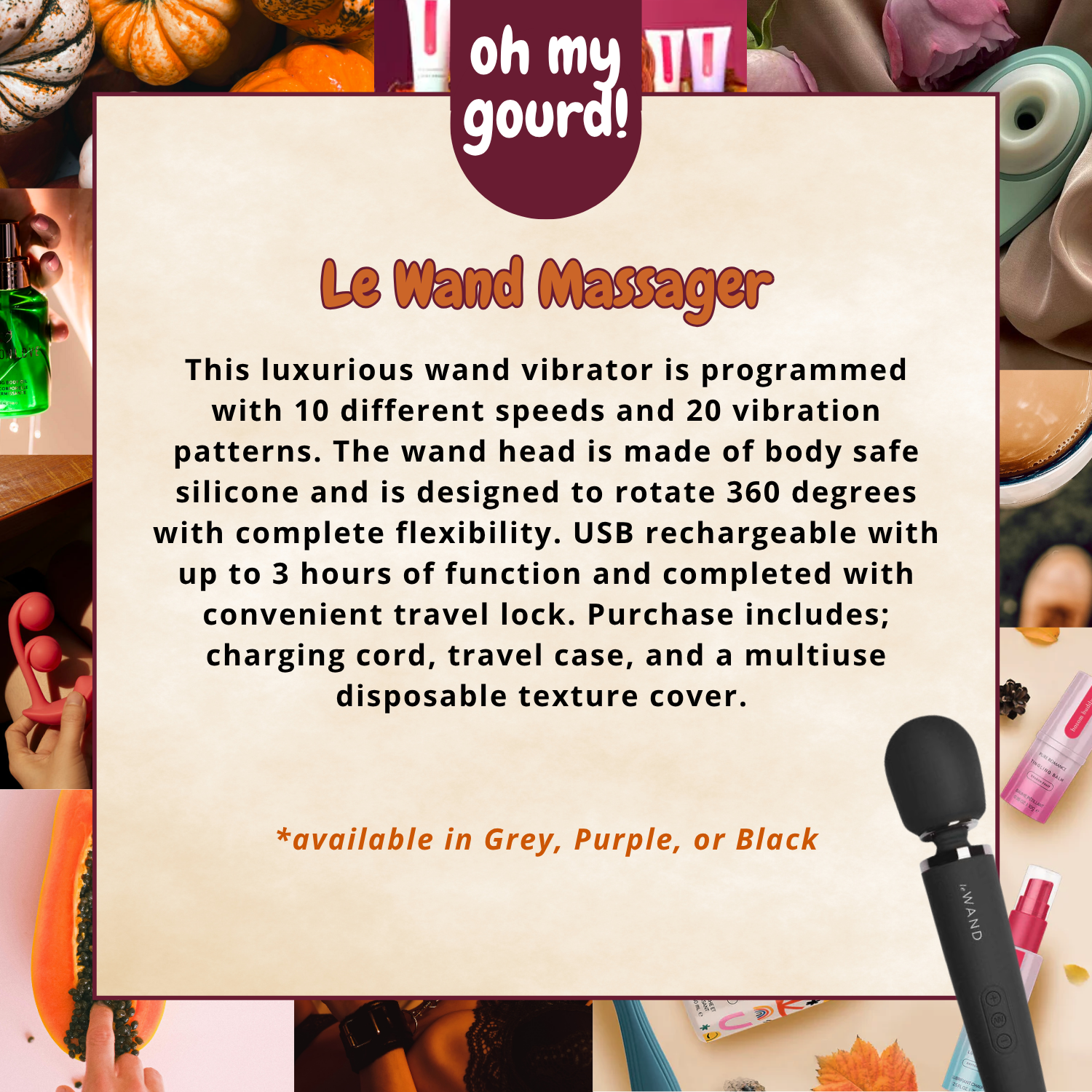 This luxurious wand vibrator is programmed with 10 different speeds and 20 vibration patterns. The wand head is made of body safe silicone and is designed to rotate 360 degrees with complete flexibility. USB rechargeable with up to 3 hours of function and completed with convenient travel lock. Purchase includes; charging cord, travel case, and a multiuse disposable texture cover.