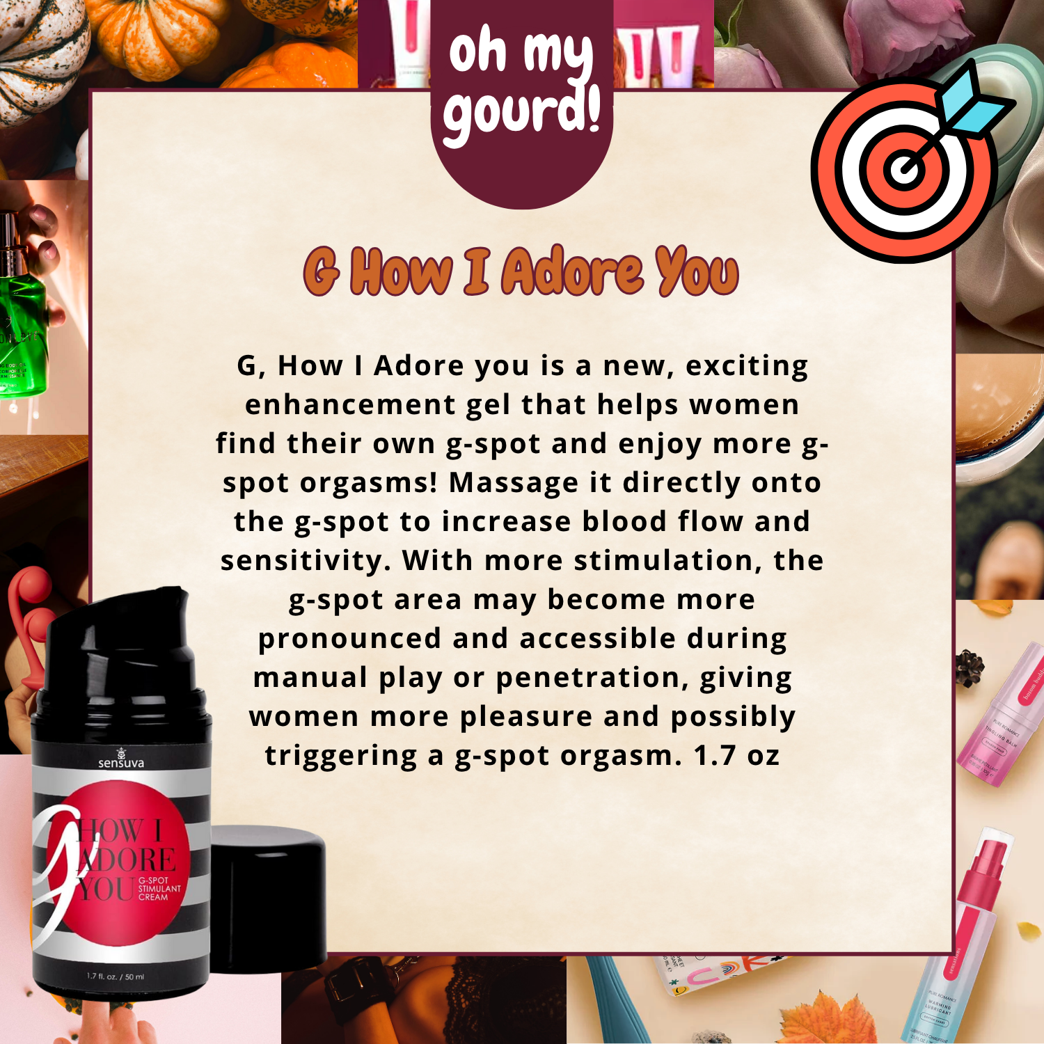 G, How I Adore you is a new, exciting enhancement gel that helps women find their own g-spot and enjoy more g-spot orgasms! massage it directly onto the g-spot to increase blood flow and sensitivity. With more stimulation, the g-spot area may become more pronounced and accessible during manual play or penetration, giving women more pleasure and possibly triggering a g-spot orgasm. G, How I Adore You G-Spot Stimulant Cream is made with healthy ingredients and natural arousal supplements such as L-Arginine, MACA, Guarana, and Menthol. It is also hydrating and pH balanced to compliment a woman's body!