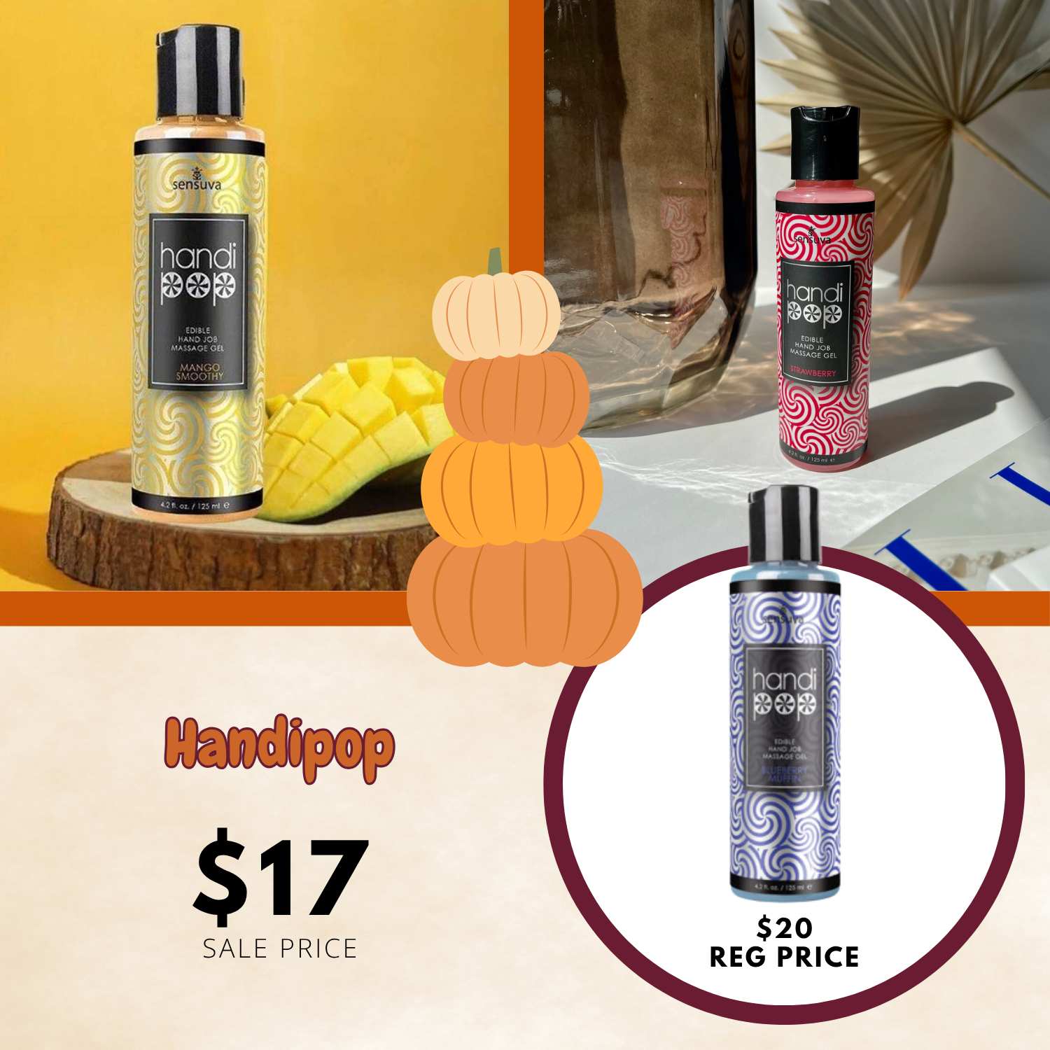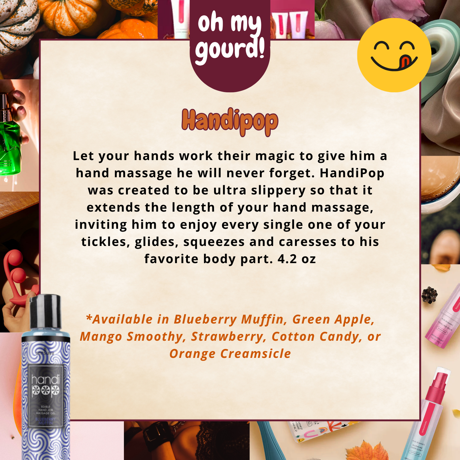 Let your hands work their magic to give him a hand massage he will never forget. HandiPop was created to be ultra slippery so that it extends the length of your hand massage, inviting him to enjoy every single one of your tickles, glides, squeezes and caresses to his favorite body part. It is fun to use with just your hands, OR combine it with other men's pleasure products like masturbation sleeves, textured toys and anything with vibration. At the end of your hand massage you can turn him into your favorite lollipop because this playful potion tastes absolutely amazing, which makes it a pleasure for you both
