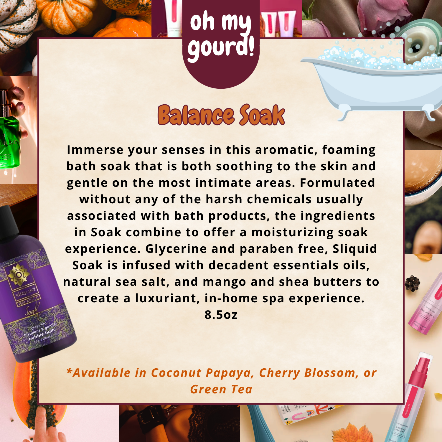 Immerse your senses in this aromatic, foaming bath soak that is both soothing to the skin and gentle on the most intimate areas. Formulated without any of the harsh chemicals usually associated with bath products, the ingredients in Soak combine to offer a moisturizing soak experience. Glycerine and paraben free, Sliquid Soak is infused with decadent cherry blossom, lemon, green tea or coconut papaya essentials oils, natural sea salt, and mango and shea butters to create a luxuriant, in-home spa experience. Slight variations in color or consistency may occur due to the key natural ingredient plant cellulose used in this product.