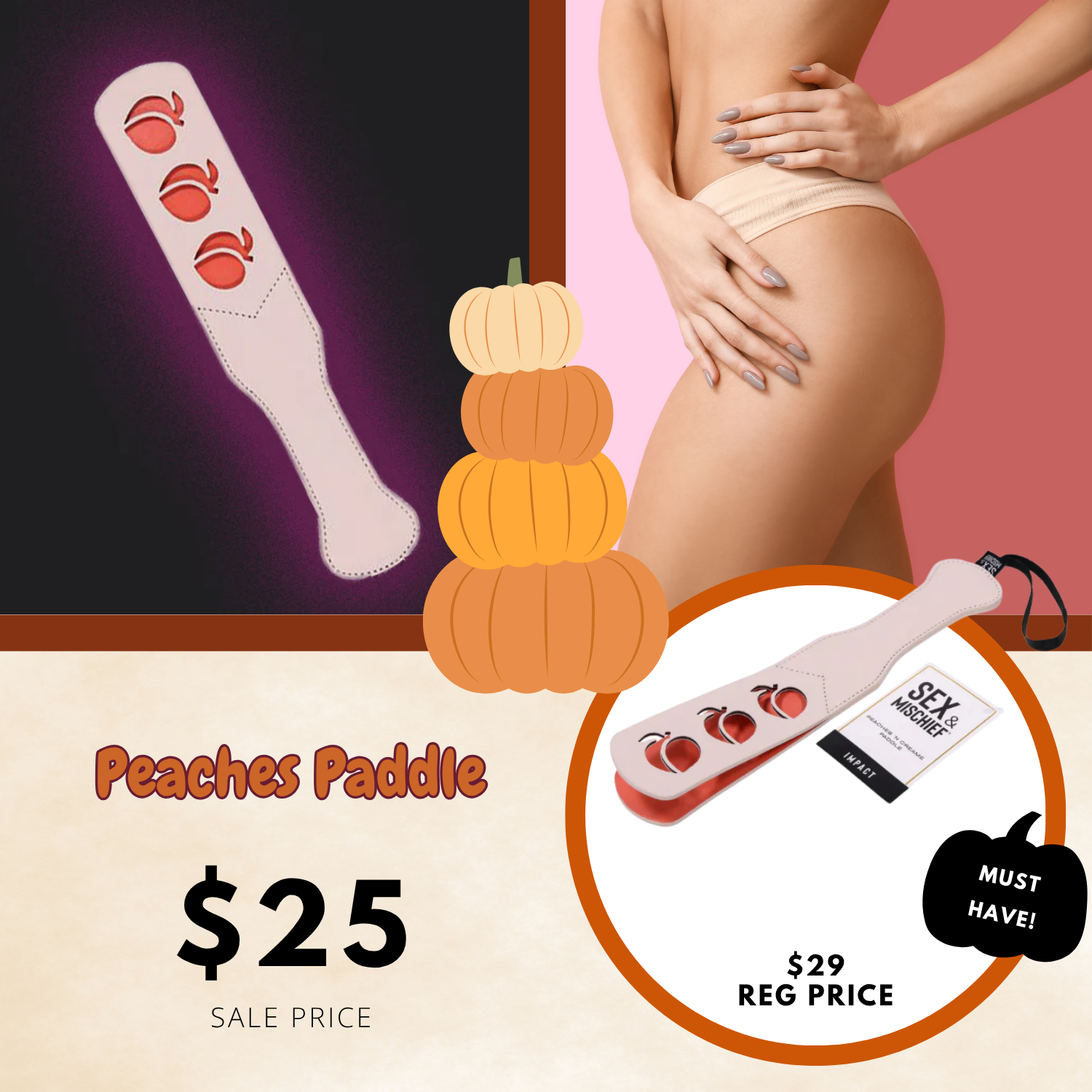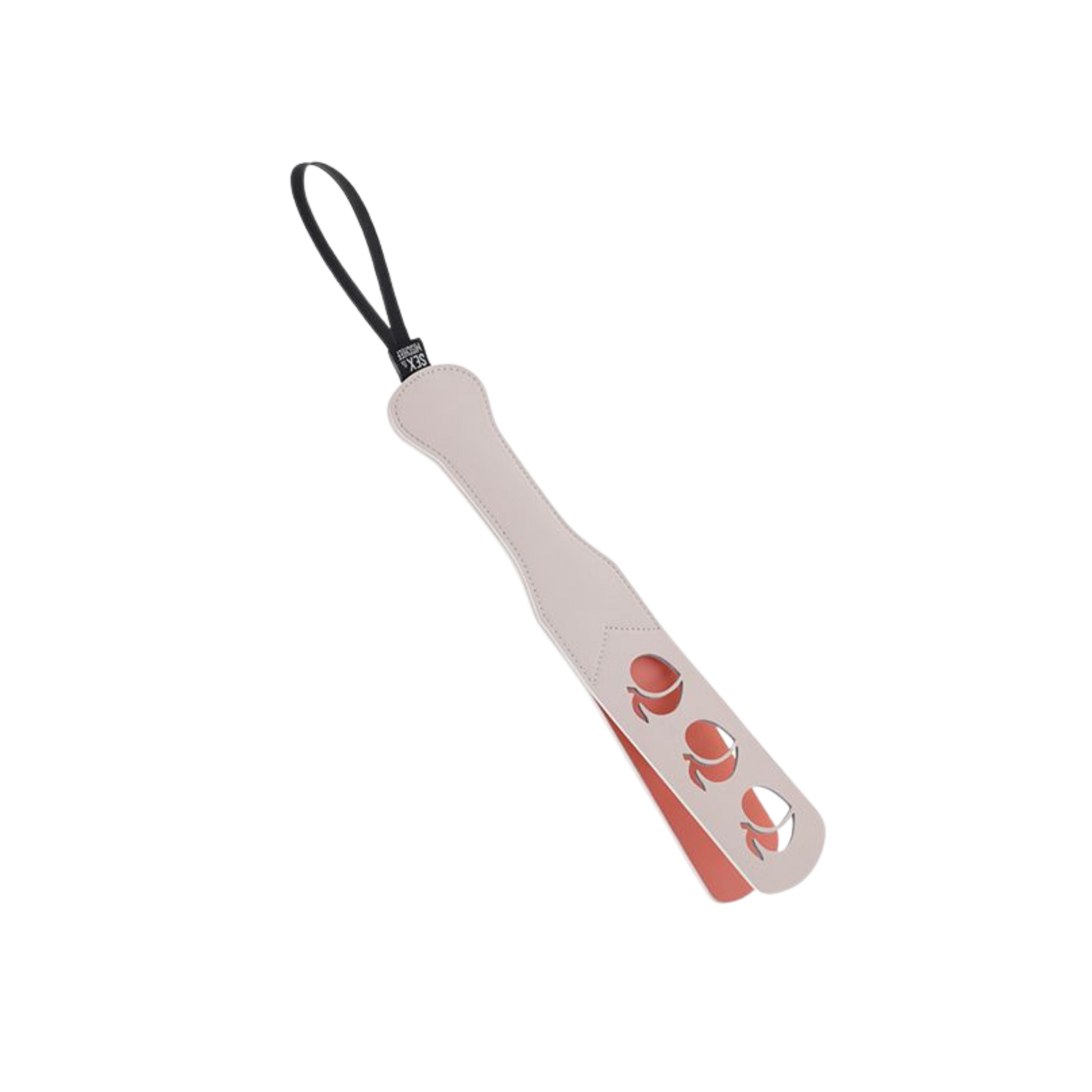 Get ready to add a fruity twist to your playful spanks with the Peaches ‘n CreaMe Peach Paddle! This petite yet powerful paddle is designed for a delightful mix of playful fun and saucy sensations. Crafted with faux leather and adorned with adorable peach-shaped cutouts, it's as charming as it is effective. The split tips offer a satisfying smack, while the peachy cutouts add a touch of whimsy with every swat at your partner’s peach. Perfectly sized for a teasing tap or a firmer spank, the Peaches ‘n CreaMe Peach Paddle is the ultimate accessory for a silly and flirty impact scene!