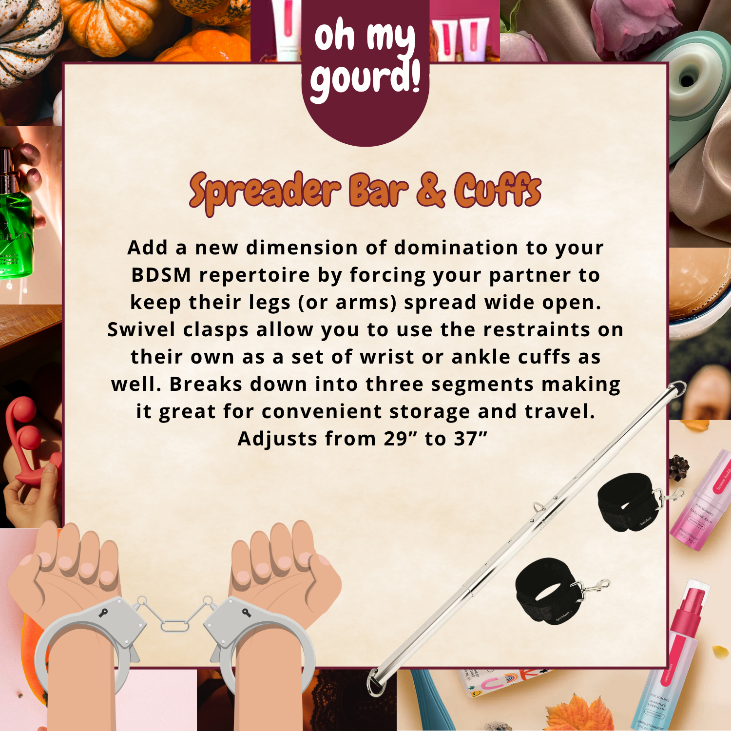 Add a new dimension of domination to your BDSM repertoire by forcing your partner to keep their legs (or arms) spread wide open. Swivel clasps allow you to use the restraints on their own as a set of wrist or ankle cuffs as well. Breaks down into three segments making it great for convenient storage and travel. Features: Adjusts from 29” to 37” (74 cm to 94cm) Breaks down into three pieces for easy storage and travel Includes two adjustable cuffs for ankles or wrists, which attach to each end of the bar Cuffs unclasp for use on their own or with other bondage systems Product Dimensions: 14.5” (37 cm) center aluminum tube, 14.5” (37 cm) spring locking expanding aluminum tubes; when assembled, expands from 29” to 37” (74 cm to 94 cm) In The Box: Expandable spreader bar 2 adjustable cuffs
