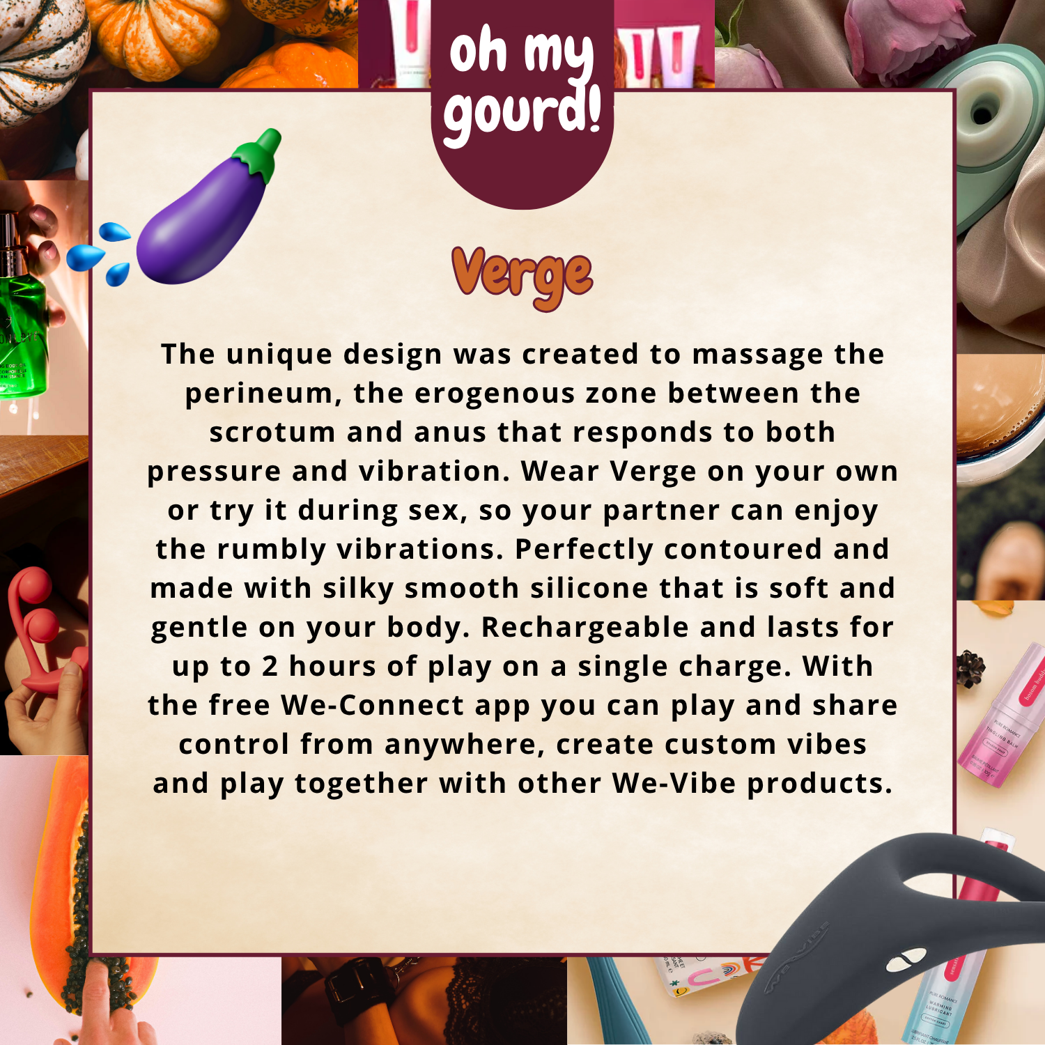 The unique design was created to massage the perineum, the erogenous zone between the scrotum and anus that responds to both pressure and vibration. Wear Verge on your own or try it during sex, so your partner can enjoy the rumbly vibrations. Perfectly contoured and made with silky smooth silicone that is soft and gentle on your body. Rechargeable and lasts for up to 2 hours of play on a single charge. With the free We-Connect app you can play and share control from anywhere, create custom vibes and play together with other We-Vibe products.